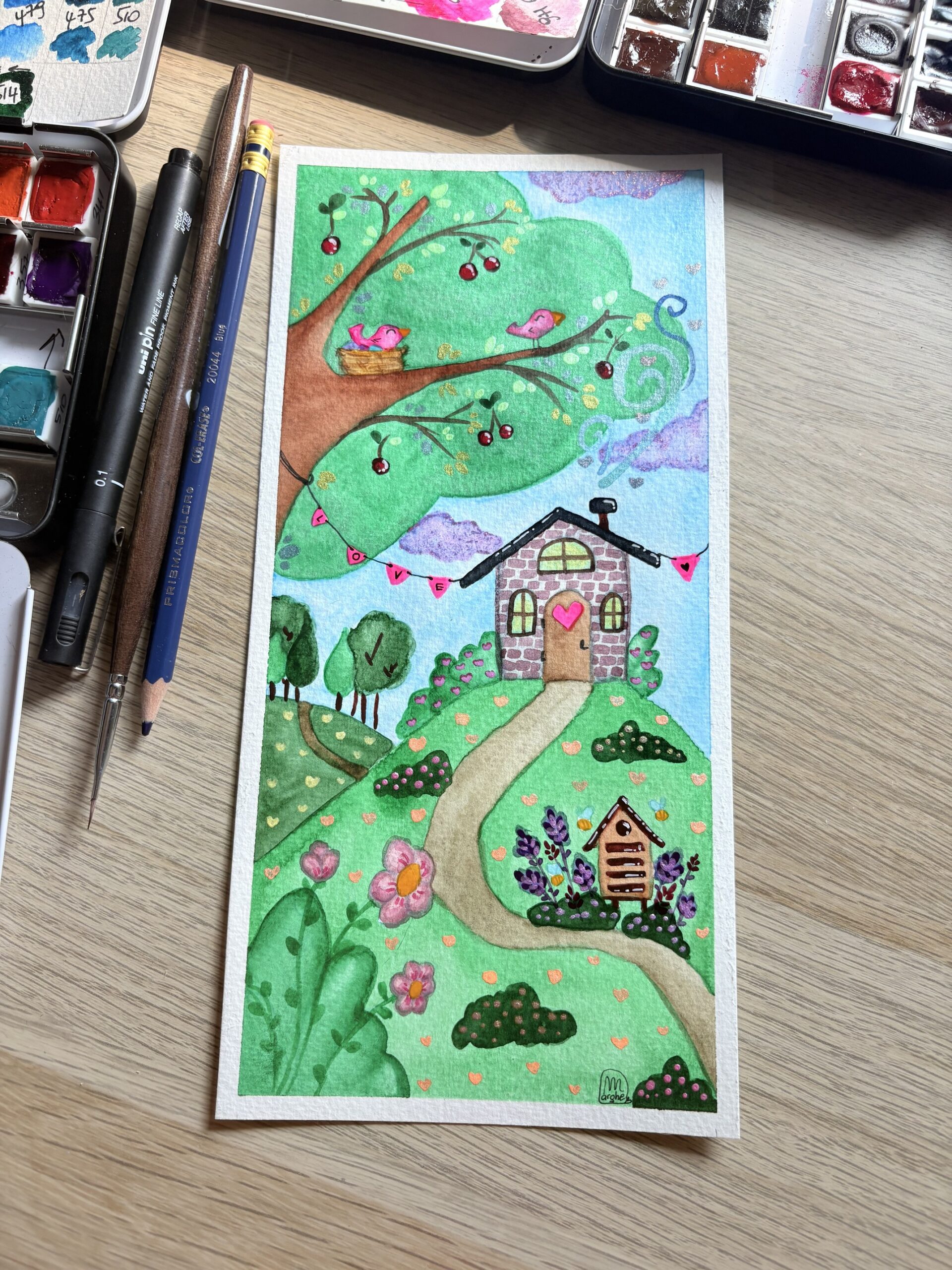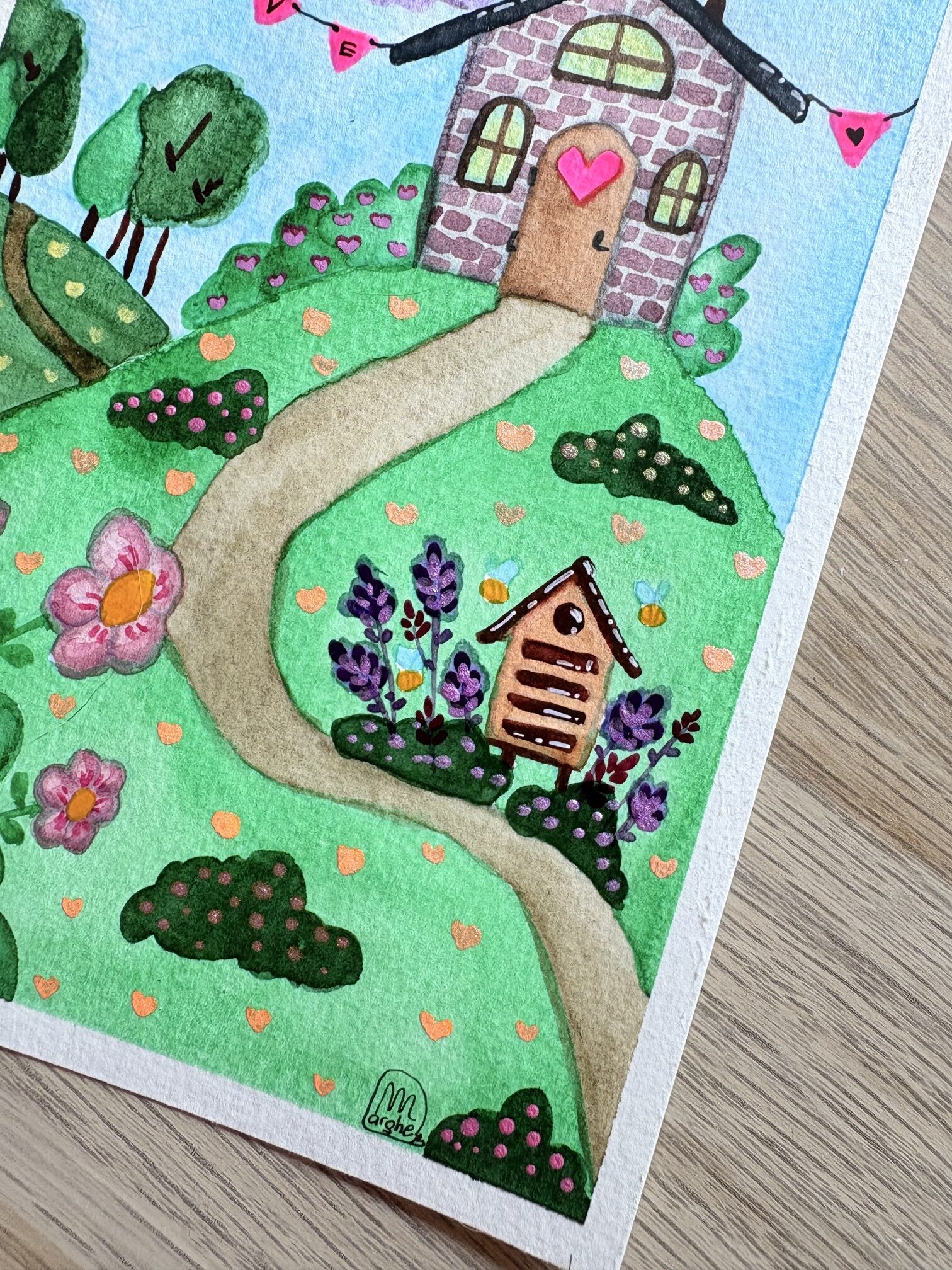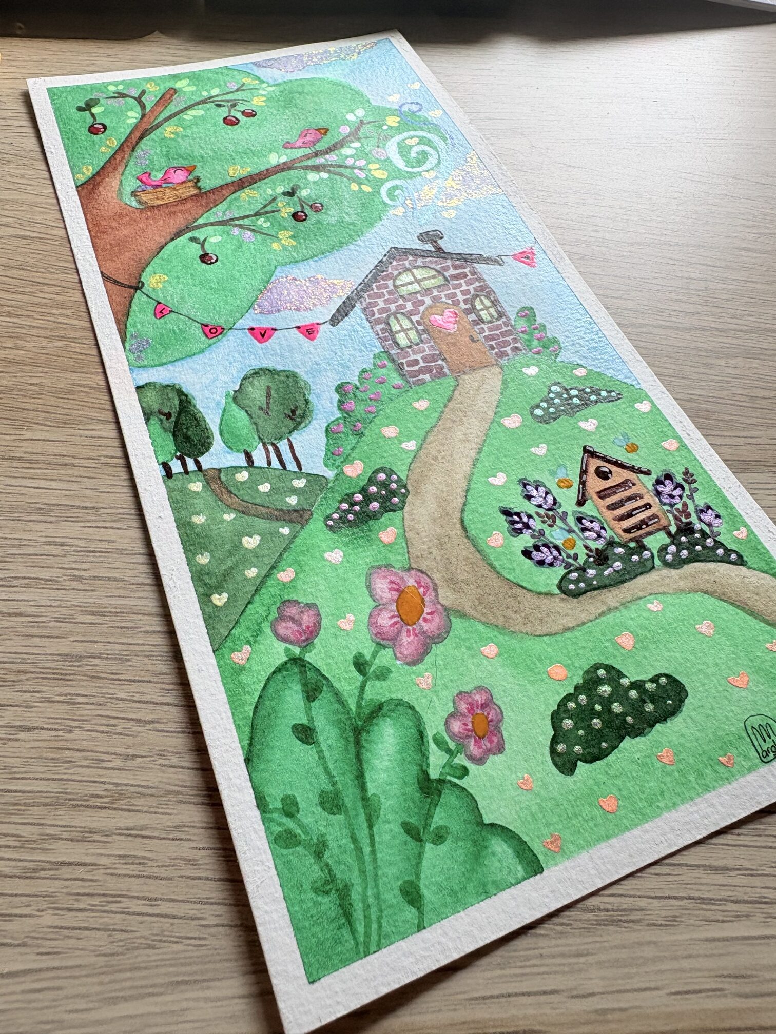 Dipinto originale acquerello su carta 100% cotone. Misura 12×25 cm. Acquerelli Schminke. Titolo opera:”Felicità e fiori”.