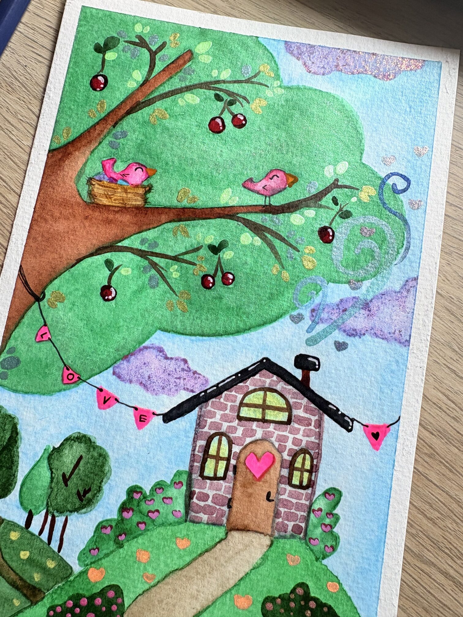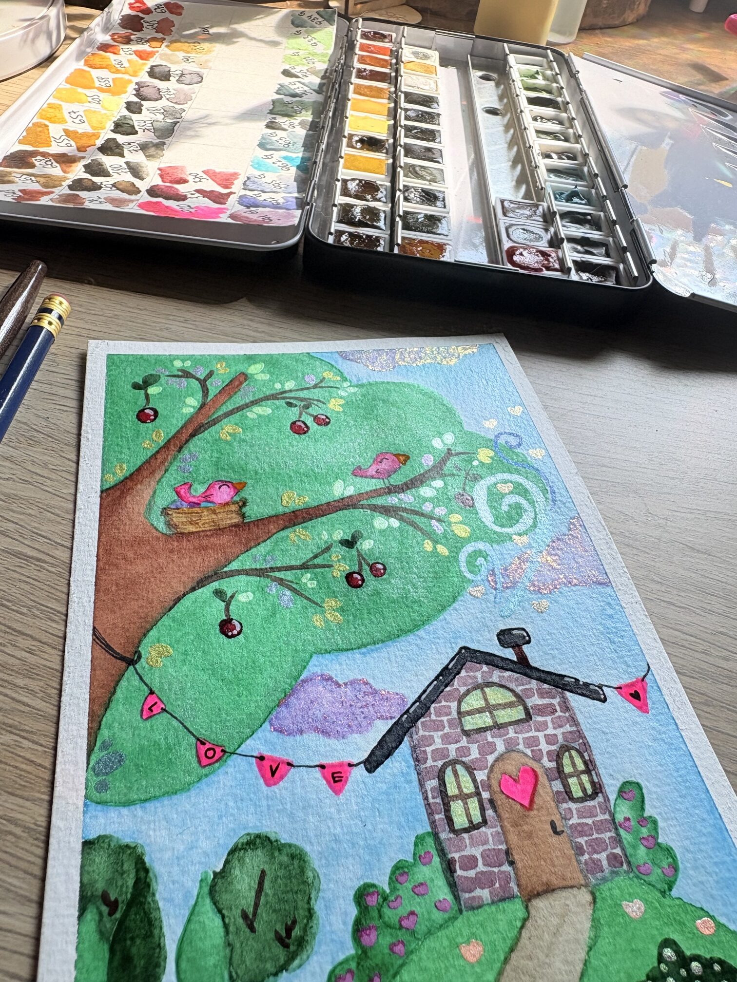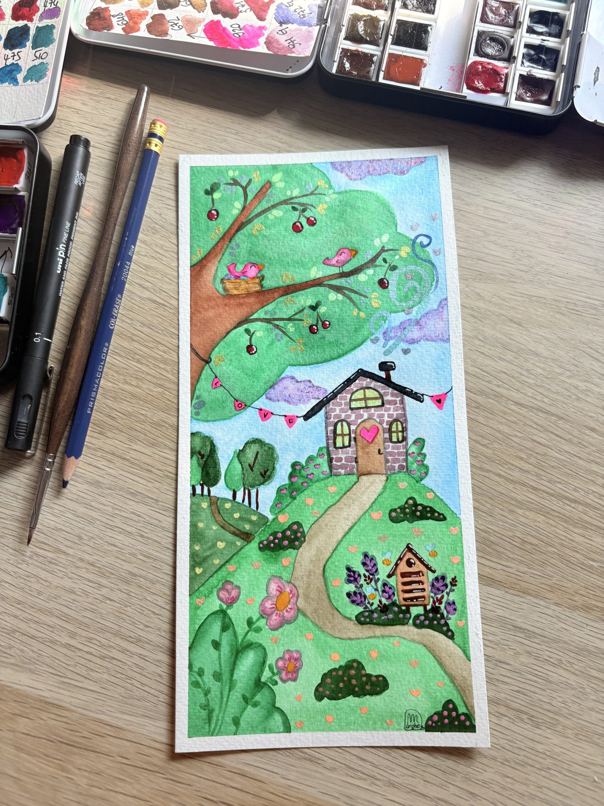 Dipinto originale acquerello su carta 100% cotone. Misura 12×25 cm. Acquerelli Schminke. Titolo opera:”Felicità e fiori”.